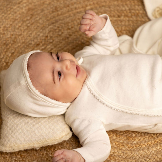 Eyelet Wrap Footie and Hat Set with White Picot Stitch