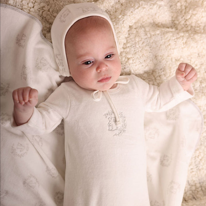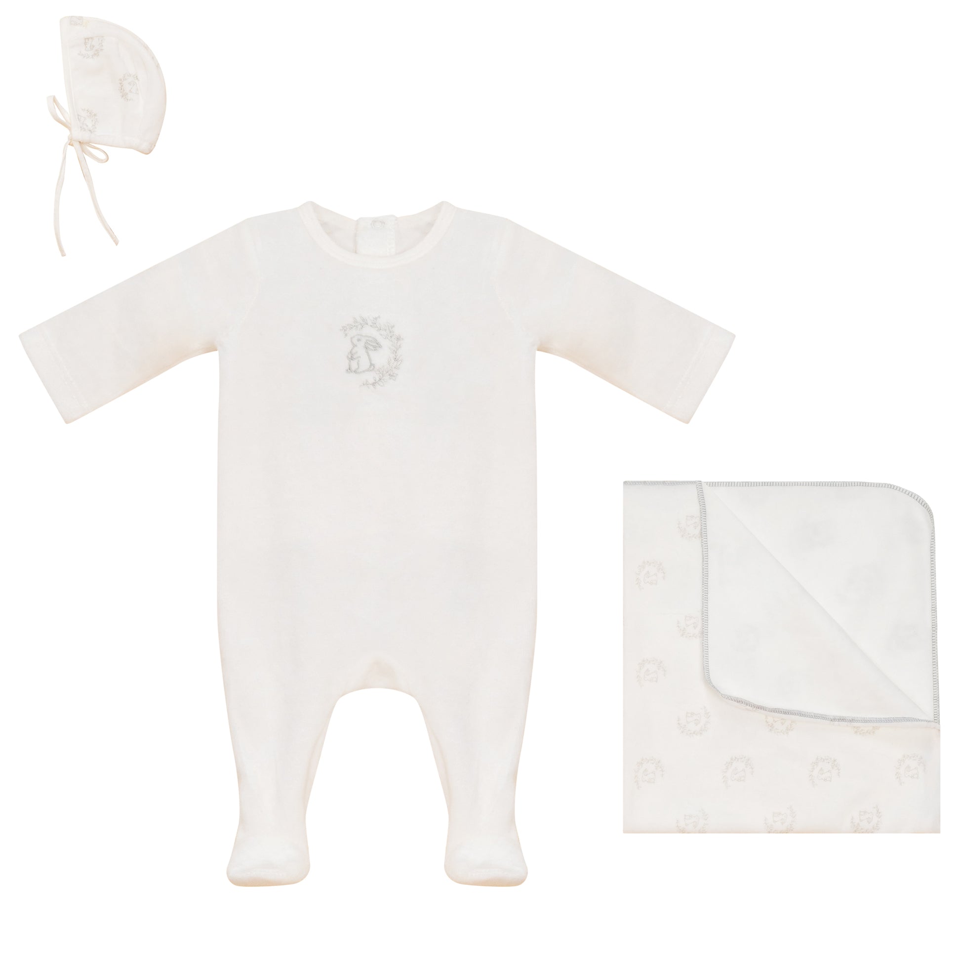 This charming baby footie features an adorable gray bunny design, perfect for keeping your little one cozy and stylish. Crafted from soft velour, the outfit ensures maximum comfort against delicate skin, while the embroidered bunny adds a delightful touch.