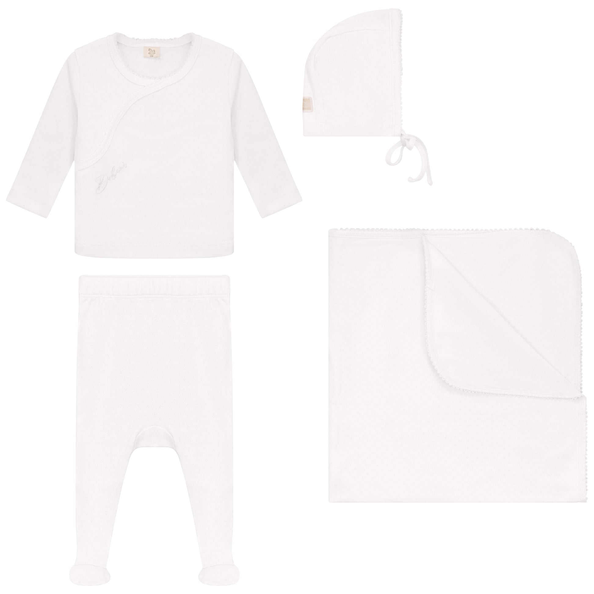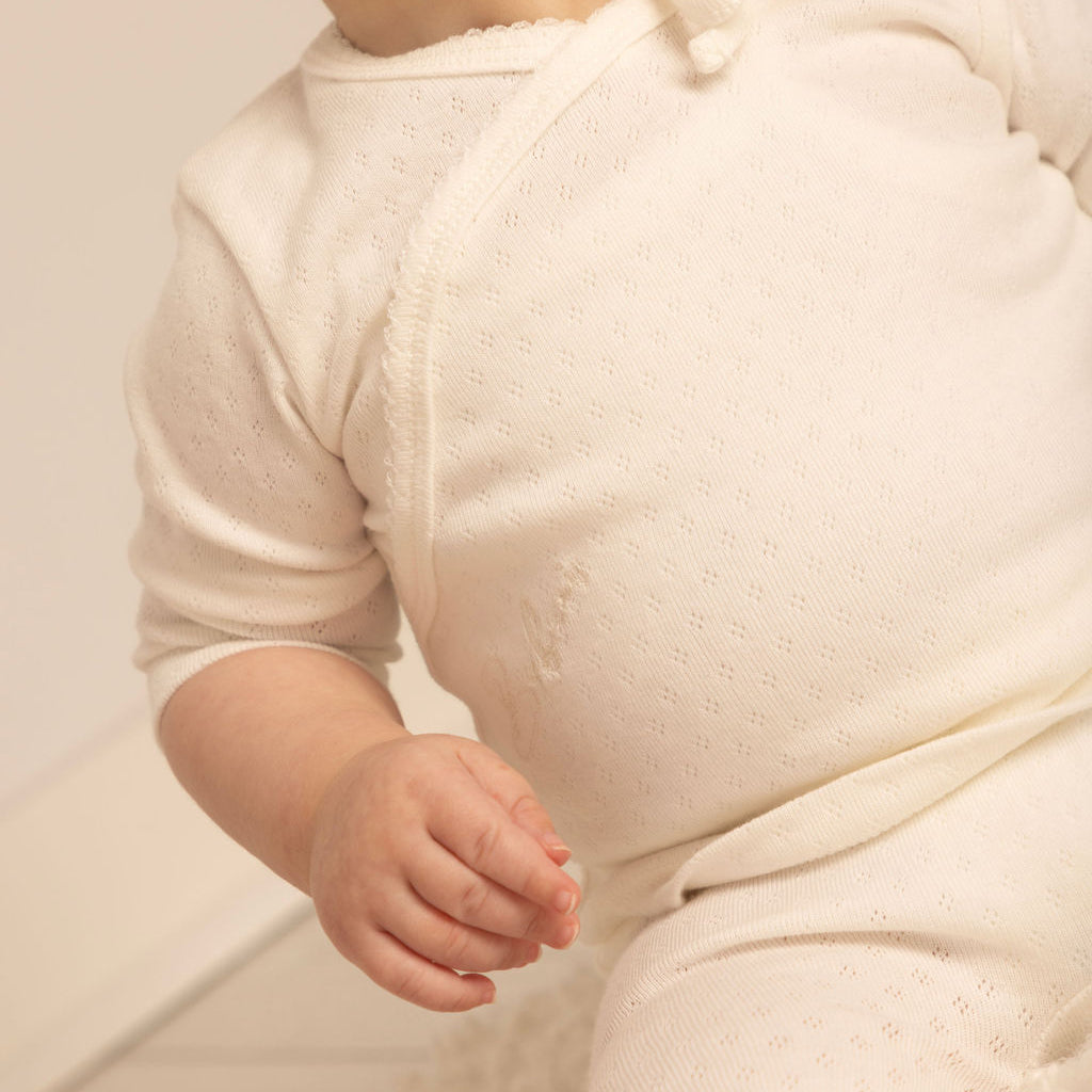 This adorable baby's outfit features a charming white wrap top adorned with delicate eyelet detailing, perfectly complemented by matching white footed pants. Crafted for comfort and style, it is ideal for any occasion, ensuring your little one looks sweet and feels cozy. The soft fabric is gentle on sensitive skin, making it a must-have addition to your baby's wardrobe.