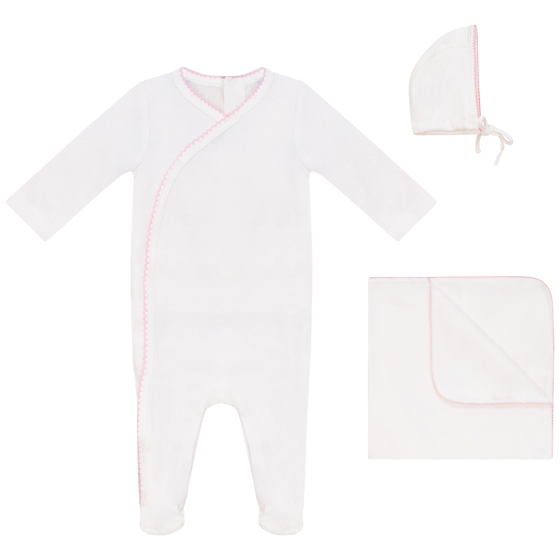 Eyelet Wrap Footie, Hat and Blanket Set with Pink Picot Stitch