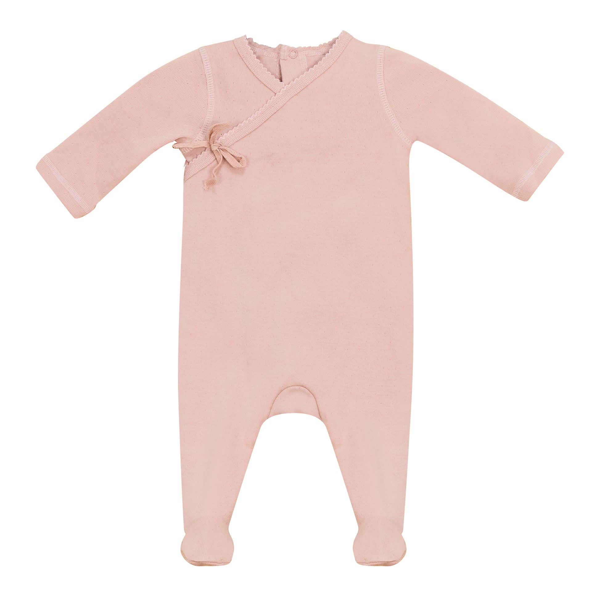 This adorable baby outfit features a soft, eyelet fabric with a wrap design for easy dressing. The long sleeve and footie style ensure that your little one stays cozy and warm. Perfect for keeping your baby comfortable and stylish all day long.