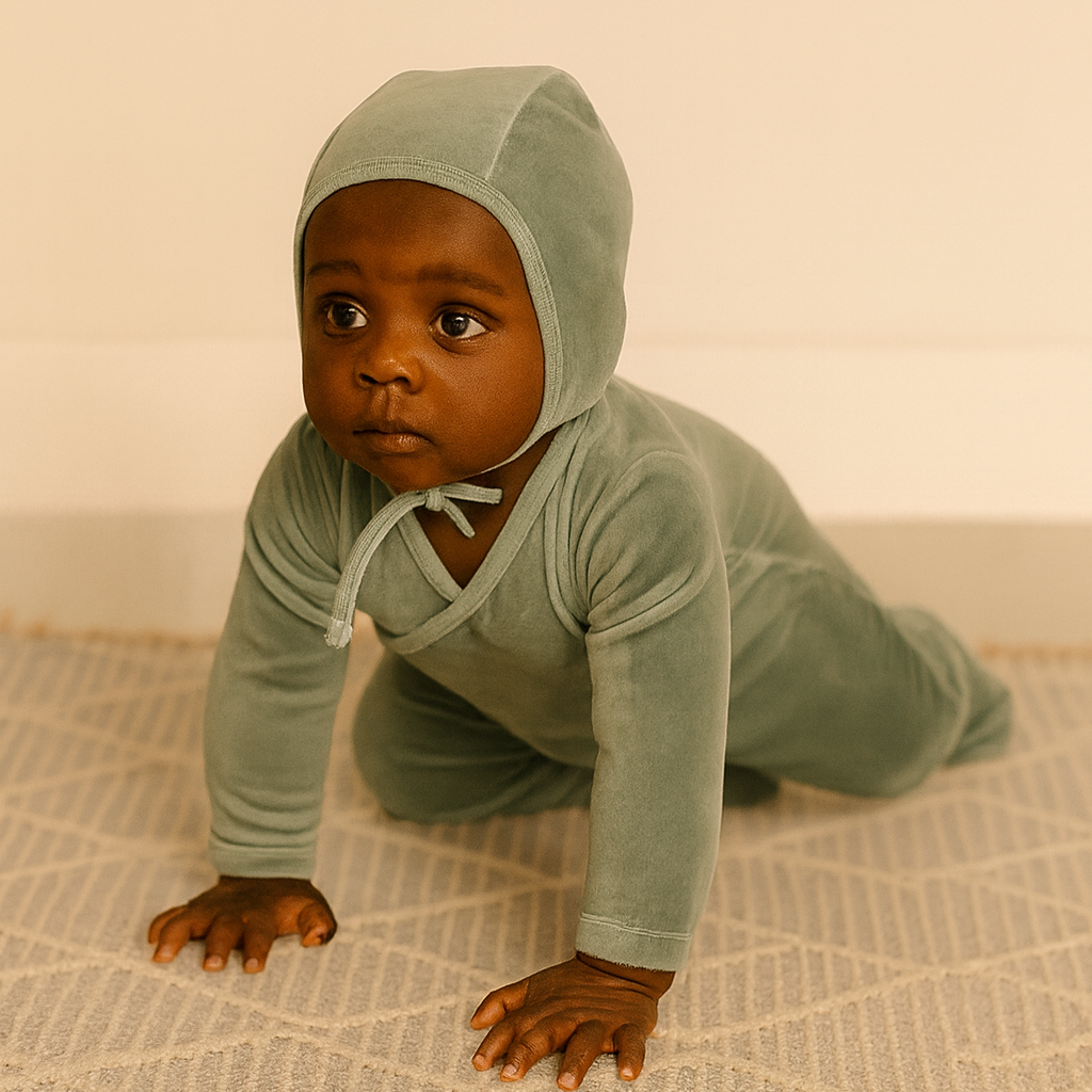 Crafted from gentle, breathable fabric, the footie keeps baby comfortable all day, while the bonnet provides extra coziness for strolls or special occasions. Perfect ad a coming-home outfit or a thoughtful baby gift, this set blends everyday comfort with timeless style.