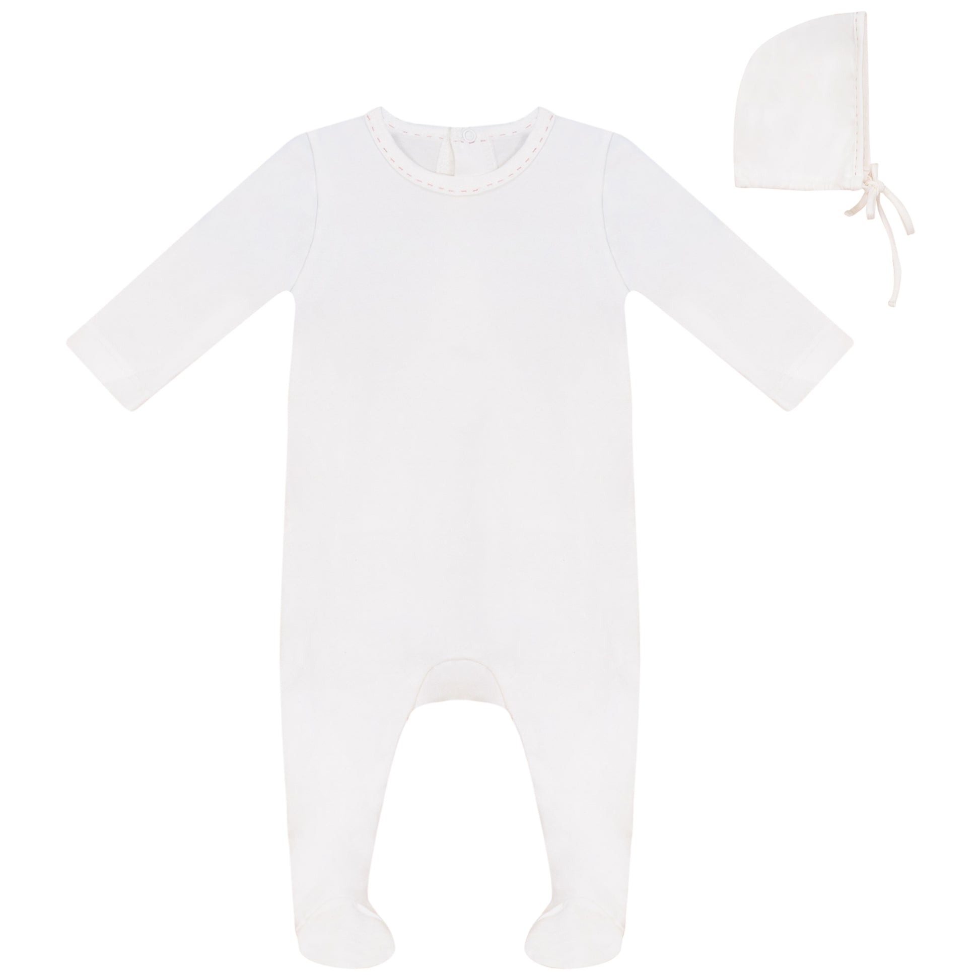 Dress your little one in this adorable white baby footie suit, featuring charming pink trimming that adds a pop of color. Perfect for keeping your baby cozy and stylish, this suit is designed for comfort and ease, making it an ideal choice for playtime or naptime.