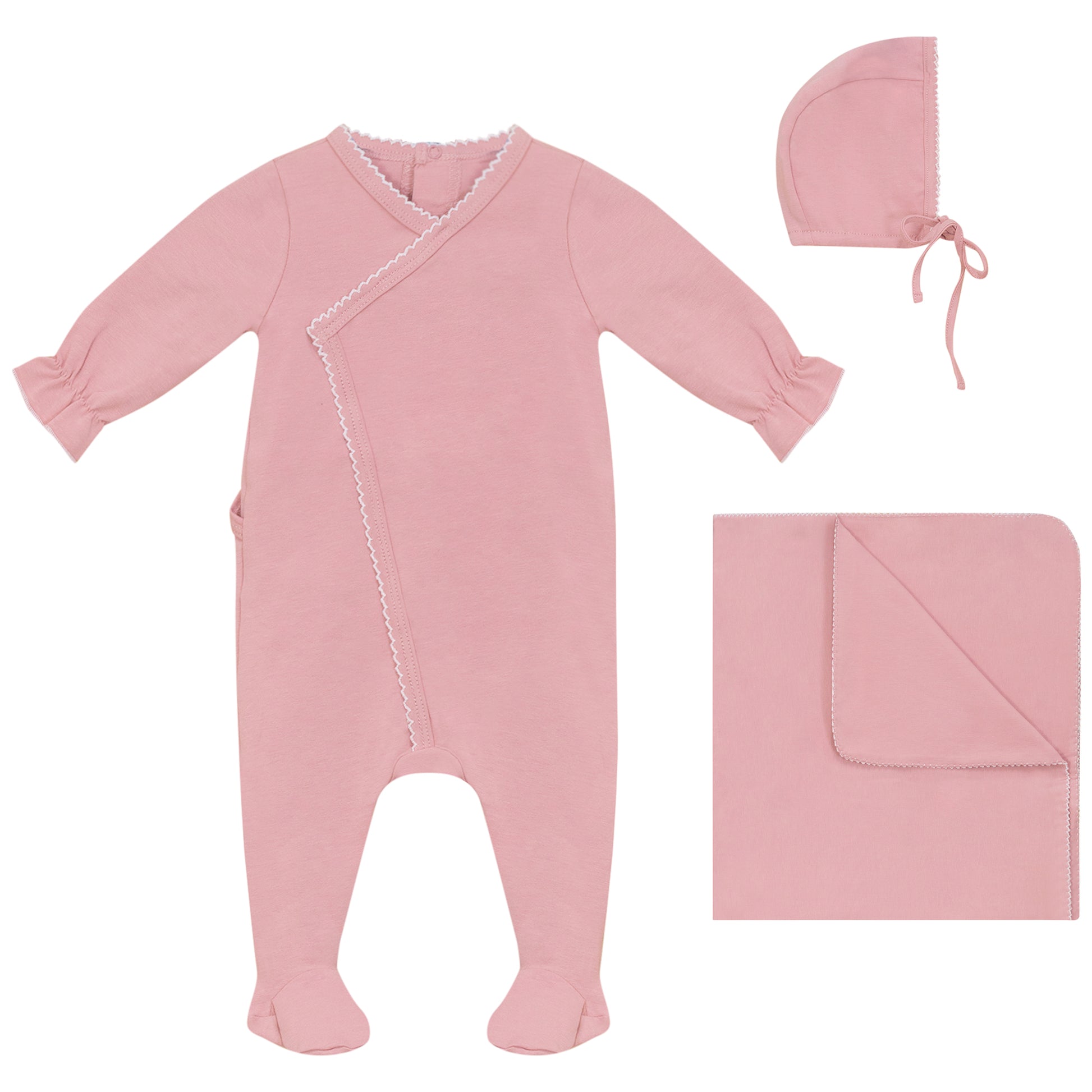Picot Stitch Wrap Footie, Hat and Blanket Set Rose