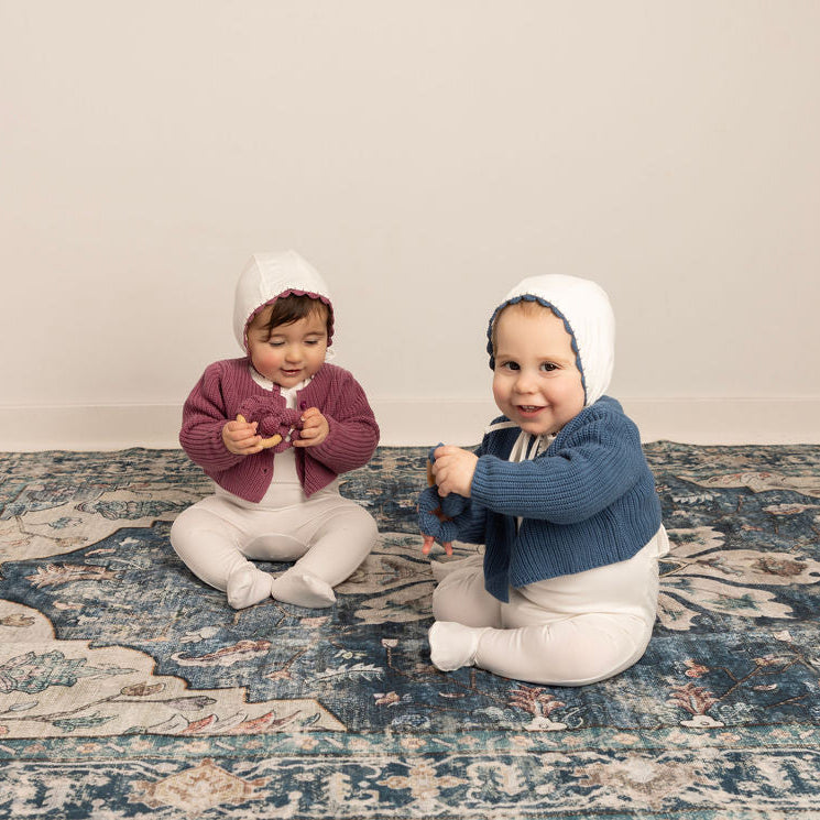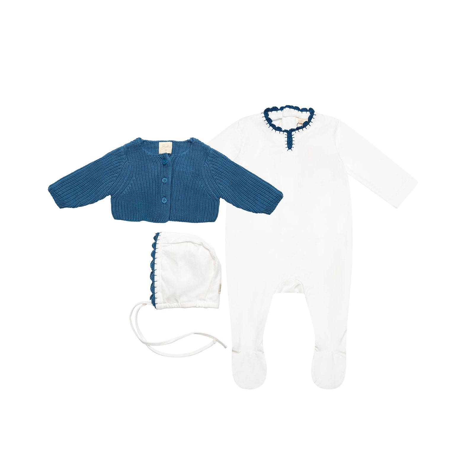 Dress your little one n timeless charm with this 3-piece newborn baby outfit set. The set includes a soft white footed onesie with a delicate blue trim, a matching bonnet and a blue knit sweater. Perfect for special occasions, coming-home outfits, or everyday comfort, this classic ensemble combines warmth, elegance and gentle fabrics made for sensitive newborn skin.